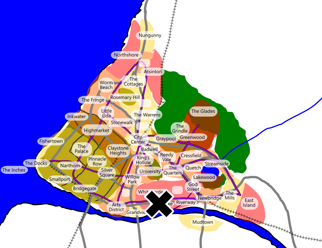 A rough map of the city of Lüm, with an X marking the neighborhood of Otter Lake. For use in the City '26 blog.