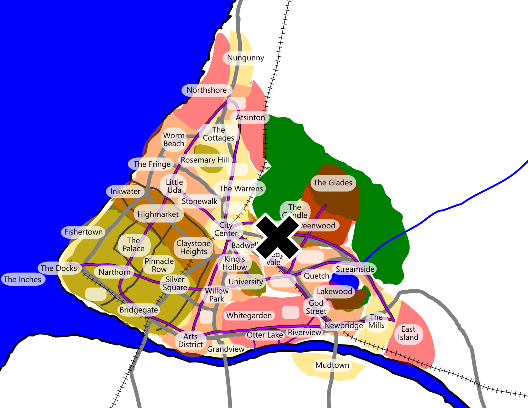 Rough map of the city of Lüm with an X indicating the location of the neighborhood of Graypool. For use in the City '26 blog.