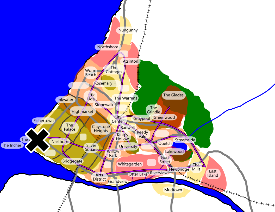 | current | 00:51, 3 March 2026 | 1,056 × 816 (487 KB) | Clé (talk | contribs) | Rough map of the city of Lüm, with an X marking the location of the Docks (Lüm). For use in the City '26 blog. |